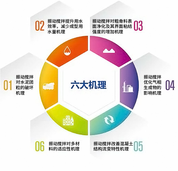 振動(dòng)攪拌是最重要的,也是最有效的一種機(jī)械強(qiáng)化方法?;炷猎谡駝?dòng)時(shí),它內(nèi)部的各個(gè)顆粒在脈沖的影響下,將圍繞某種不穩(wěn)定平衡的中間位置作連續(xù)不斷的振動(dòng),并且使相鄰粒子振動(dòng)發(fā)生位移,物料顆粒間的相對運(yùn)動(dòng)頻率增加,從而使顆粒之間的摩擦力和粘著力急劇減小,振動(dòng)攪拌就是利用混凝土這一特性,以達(dá)到混凝土在宏觀和微觀上的勻質(zhì)。同時(shí),振動(dòng)攪拌使水泥顆粒的運(yùn)動(dòng)速度增加,并能增加物料顆粒間相互碰撞的次數(shù)和加快水泥水化作用。此外,還可凈化集料表面,增加水泥和集料間的粘結(jié)力。
