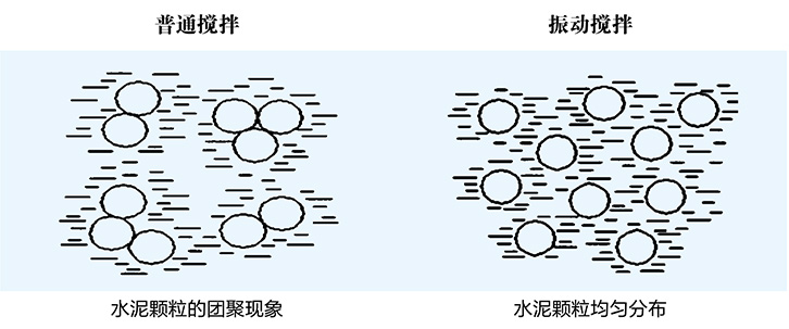 混凝土中的水泥漿放在顯微鏡下,會(huì)發(fā)現(xiàn)水泥顆粒并沒有均勻地分散在水中,有10%~30%的水泥顆粒零散地聚在一起,形成微小的水泥團(tuán),導(dǎo)致水泥的水化作用面積減少,水泥的這種團(tuán)聚現(xiàn)象影響著混凝土工作性能和耐久性能的提高,所以必須把團(tuán)聚的水泥顆粒和細(xì)集料顆粒分開,使其盡可能接近所示的理想分布狀態(tài)。